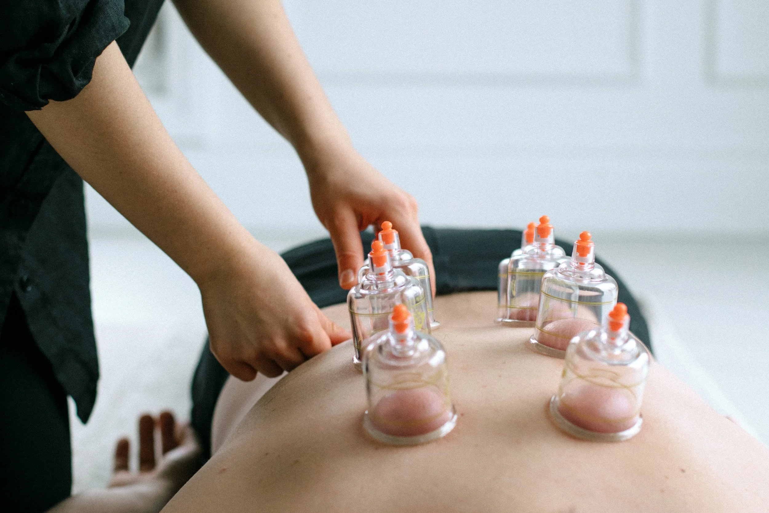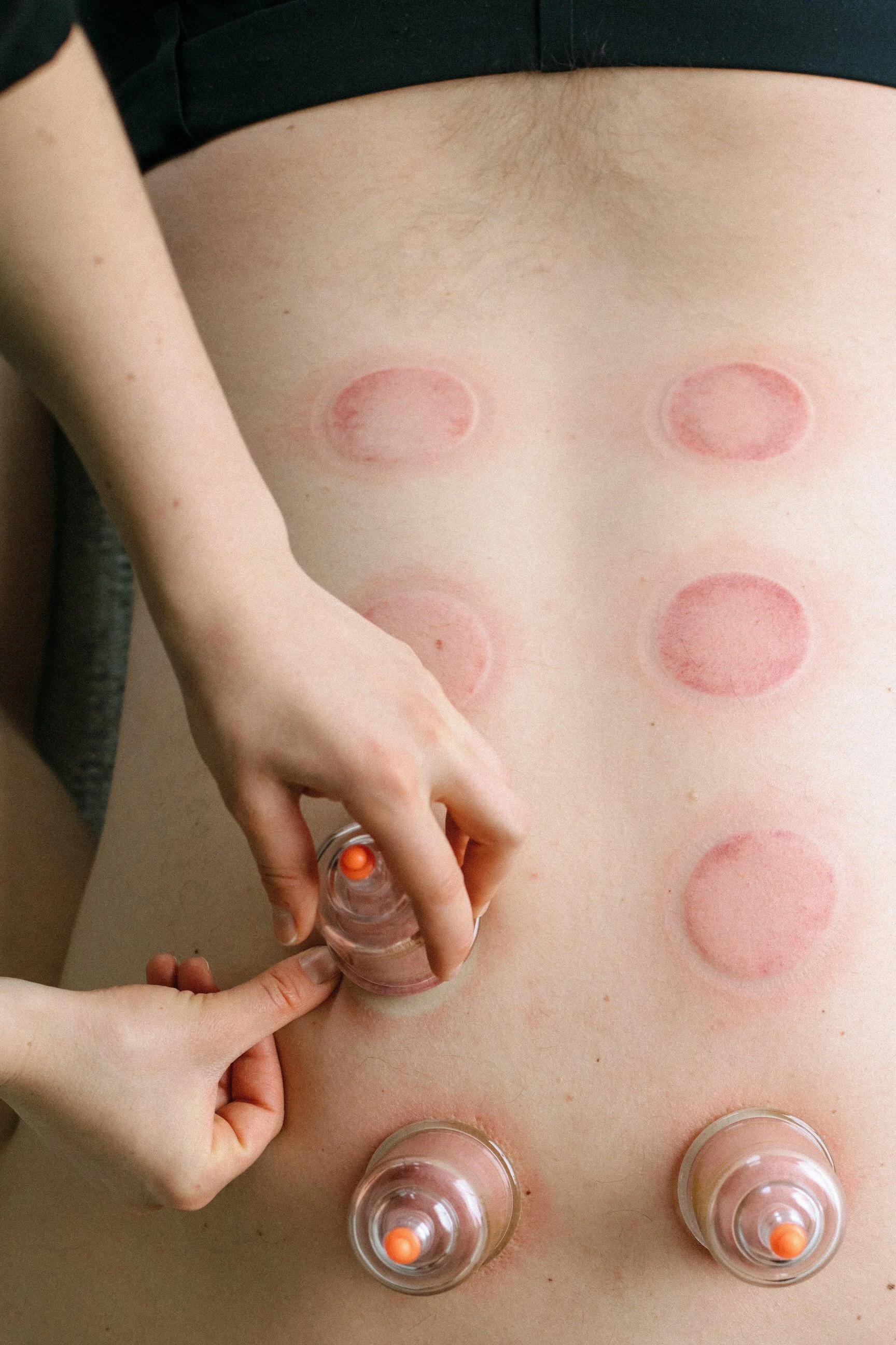 Cupping is a physical therapy used in traditional Chinese medicine, where suction is created on the skin. Glass, silicone or plastic cups are used pull the tissue upwards.
